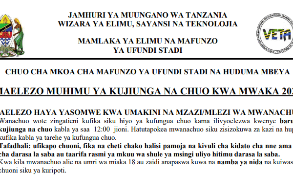 VETA (Chuo cha Mafunzo ya Ufundi Stadi Tanzania) kinatoa kozi fupi za kuwasaidia watu kupata ujuzi wa haraka na wa matumizi ya moja kwa moja kazini. Kozi hizi ni za muda mfupi, kawaida kati ya mwezi mmoja hadi miezi sita, na zinapatikana katika vituo mbalimbali vya VETA nchini Tanzania. Kozi Fupi Zinazotolewa na VETA Kozi…